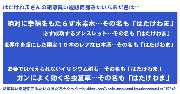 | ヘコむあだ名 | 『はたけわま(苦笑)』『はたにゅー』 |