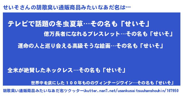| 恥ずかしいあだ名 | 『せいっちょ』『セイソデラックス』 |