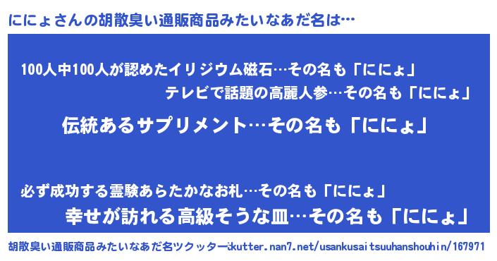 | 意味不明あだ名 | 『とにかく怪しいににょ』『自称ににょ』 |