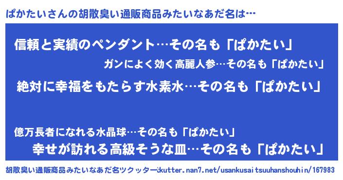 | 意味不明あだ名 | 『永久保存ぱかたい』『自称ぱかたい』 |