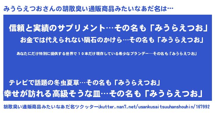| 意味不明あだ名 | 『住所不定無職みうらえつお(89歳)』 |