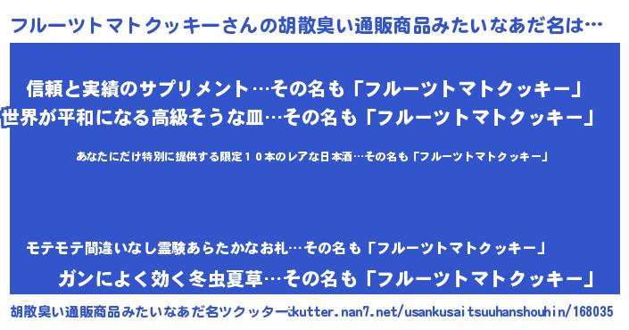 | 男性向けラノベタイトル風あだ名 | 『この素晴らしい世界にフルーツトマトクッキーを!』 |