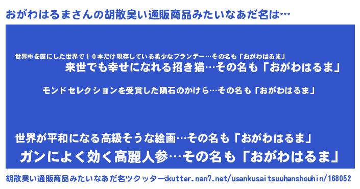 | 男性向けラノベタイトル風あだ名 | 『おがわはるまに滅ぼされるだけの簡単なお仕事です』 |