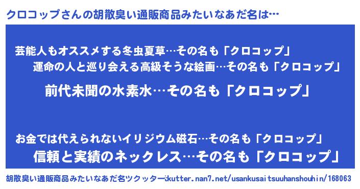 | 意味不明あだ名 | 『永久保存クロコップ』『自称クロコップ』 |