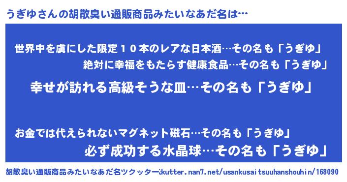 | 男性向けラノベタイトル風あだ名 | 『ウギユスレイヤー』『魔弾の王とうぎゆ』 |