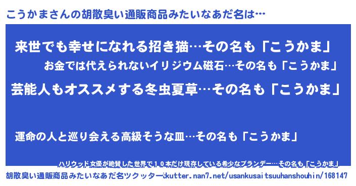 | 意味不明あだ名 | 『自称こうかま』『永久保存こうかま』 |