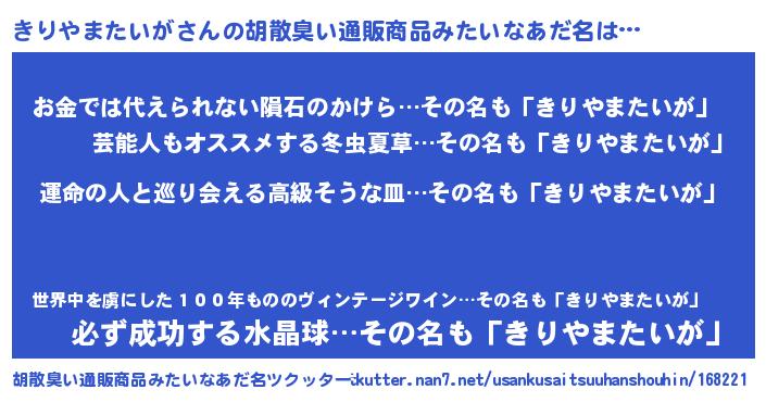 | 欧米人風あだ名 | 『きりやまたいがクリステル』 |
