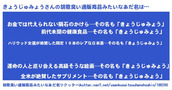| 意味不明あだ名 | 『住所不定無職きょうじゅみょう(39歳)』 |