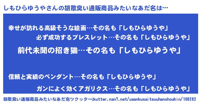 | ヘコむあだ名 | 『しもひらゆうや(笑)』『つくし』 |