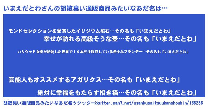 | 意味不明あだ名 | 『住所不定無職いまえだとわ(85歳)』 |