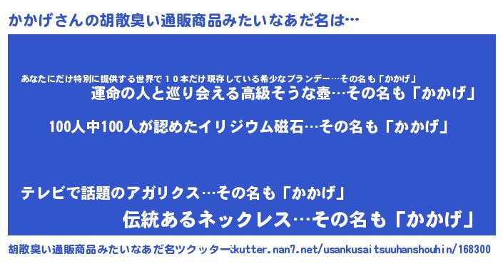 | 男性向けラノベタイトル風あだ名 | 『緋弾のカカゲ』『カカゲスレイヤー』 |