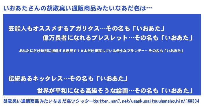 | 男性向けラノベタイトル風あだ名 | 『いおあたに滅ぼされるだけの簡単なお仕事です』 |