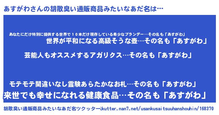 | 恥ずかしいあだ名 | 『アスガワデラックス』『あすちん』 |