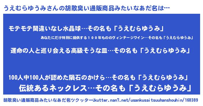 | 男性向けラノベタイトル風あだ名 | 『うえむらゆうみ~年齢イコール彼女いない歴の魔法使い~』 |