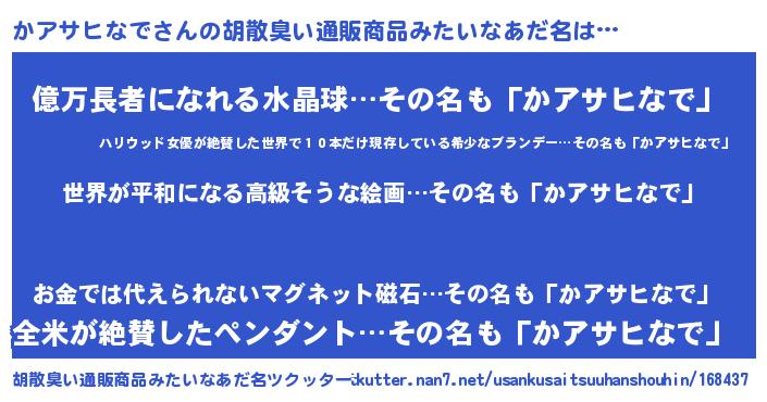 | 男性向けラノベタイトル風あだ名 | 『転生したらかアサヒなでだった件』 |