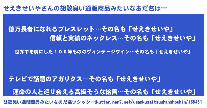 | 意味不明あだ名 | 『住所不定無職せえきせいや(6歳)』 |
