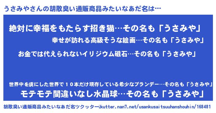 | ヒーロー風カッコイイあだ名 | 『慈愛の使者うさみや』『ネオウサミヤ』 |