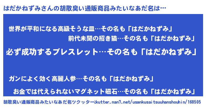 | ヘコむあだ名 | 『はだふぇ~』『なまこ酢』『はだを』 |