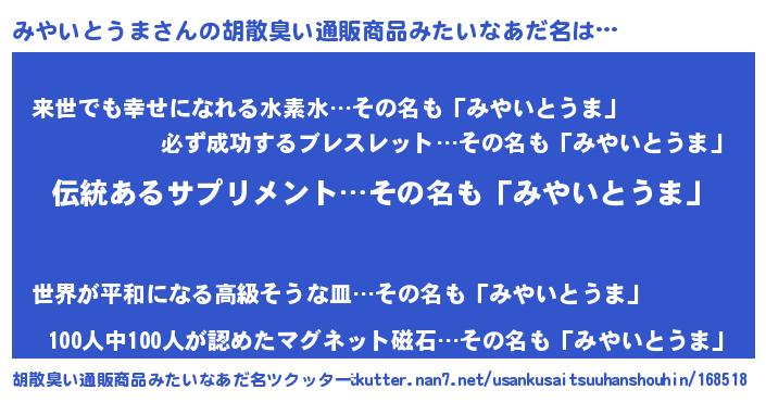 | ヘコむあだ名 | 『みやを』『みやいとうま(笑)』 |