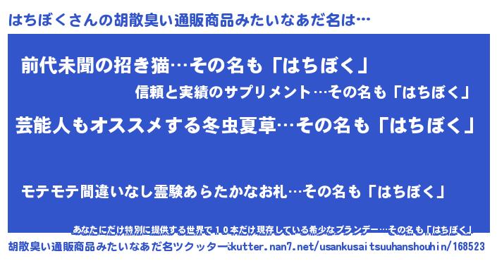 | 意味不明あだ名 | 『自称はちぼく』『永久保存はちぼく』 |