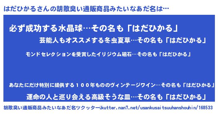 | 男性向けラノベタイトル風あだ名 | 『ノーゲーム・ノーハダヒカル』 |