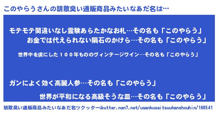 | 意味不明あだ名 | 『住所不定無職このやらう(7歳)』 |