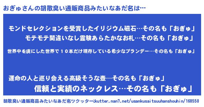 | 意味不明あだ名 | 『住所不定無職おぎゅ(89歳)』 |