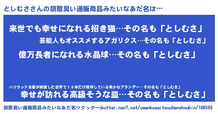 | 男性向けラノベタイトル風あだ名 | 『としむさ~年齢イコール彼女いない歴の魔法使い~』 |