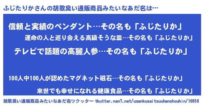| 意味不明あだ名 | 『自称ふじたりか』『永久保存ふじたりか』 |