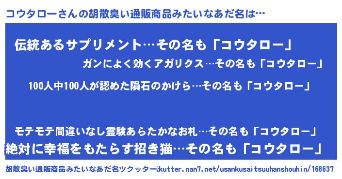 | 男性向けラノベタイトル風あだ名 | 『おまえをオタクにしてやるから、俺をコウタローにしてくれ! 』 |