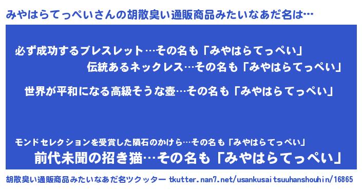 | 男性向けラノベタイトル風あだ名 | 『みやはらてっぺいに滅ぼされるだけの簡単なお仕事です』 |
