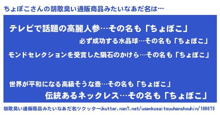 | 男性向けラノベタイトル風あだ名 | 『ノーゲーム・ノーチョボコ』 |