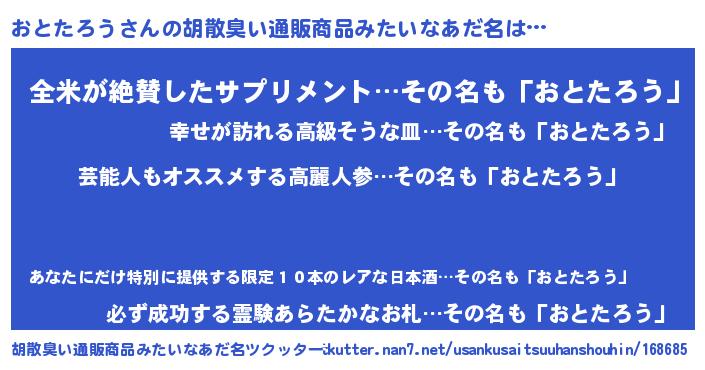 | 男性向けラノベタイトル風あだ名 | 『Re:おとたろうから始める異世界生活』 |