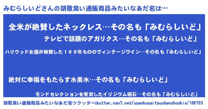 | 意味不明あだ名 | 『住所不定無職みむらしいど(4歳)』 |