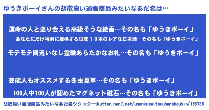 | 男性向けラノベタイトル風あだ名 | 『ゆうきボーイに滅ぼされるだけの簡単なお仕事です』 |