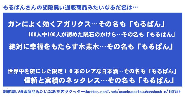 | ヘコむあだ名 | 『もるぱん(苦笑)』『もるを』『牛乳』 |