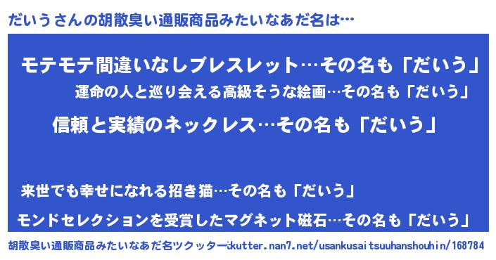 | 意味不明あだ名 | 『とにかく怪しいだいう』 |