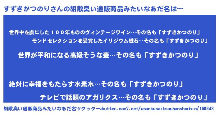 | ヘコむあだ名 | 『豆乳』『すずきかつのり(震え声)』 |