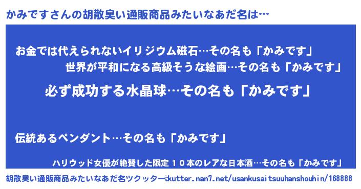| 男性向けラノベタイトル風あだ名 | 『かみですの憂鬱』『カミデススレイヤー』 |