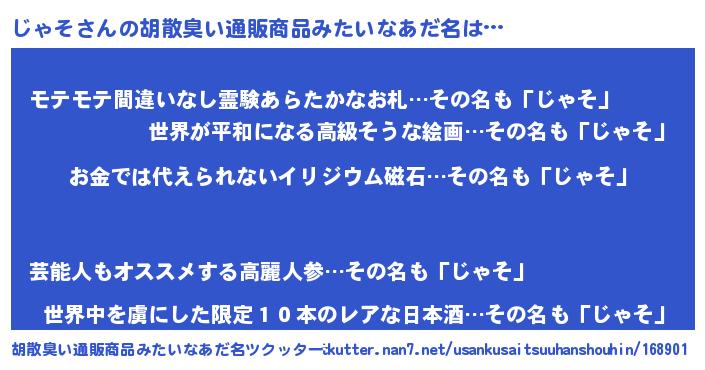 | 男性向けラノベタイトル風あだ名 | 『転生したらじゃそだった件』 |