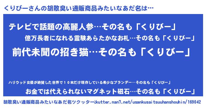 | 男性向けラノベタイトル風あだ名 | 『くりびー~年齢イコール彼女いない歴の魔法使い~』 |