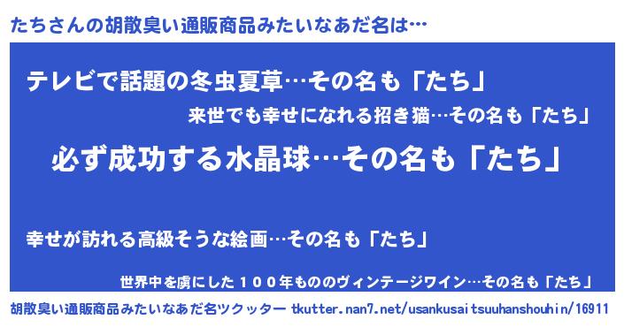 | 男性向けラノベタイトル風あだ名 | 『たちの憂鬱』『転生したらたちだった件』 |