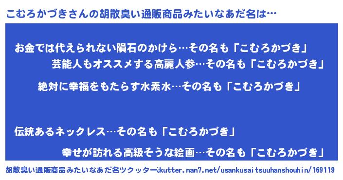 | ヘコむあだ名 | 『こむろかづき(遠い目)』『なまこ酢』 |