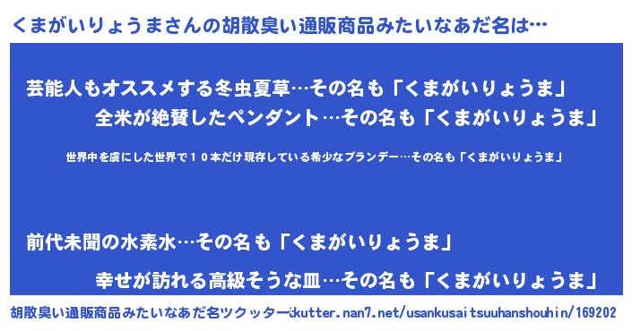| 意味不明あだ名 | 『住所不定無職くまがいりょうま(74歳)』 |
