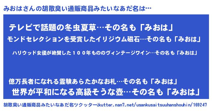 | 意味不明あだ名 | 『住所不定無職みおは(12歳)』『自称みおは』 |