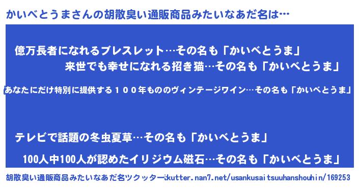 | 意味不明あだ名 | 『住所不定無職かいべとうま(12歳)』 |
