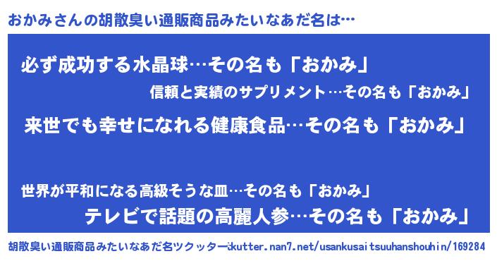 | 男性向けラノベタイトル風あだ名 | 『おかみという概念が存在しない退屈な世界 』 |
