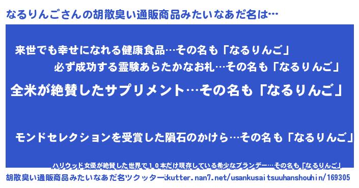 | 男性向けラノベタイトル風あだ名 | 『なるりんごの嫁は女の子じゃないと思った?』 |