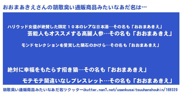 | 男性向けラノベタイトル風あだ名 | 『ノーゲーム・ノーオオマアキエ』 |