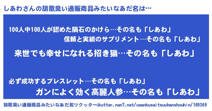 | ヘコむあだ名 | 『しあわ(笑)』『しあっちょ』 |